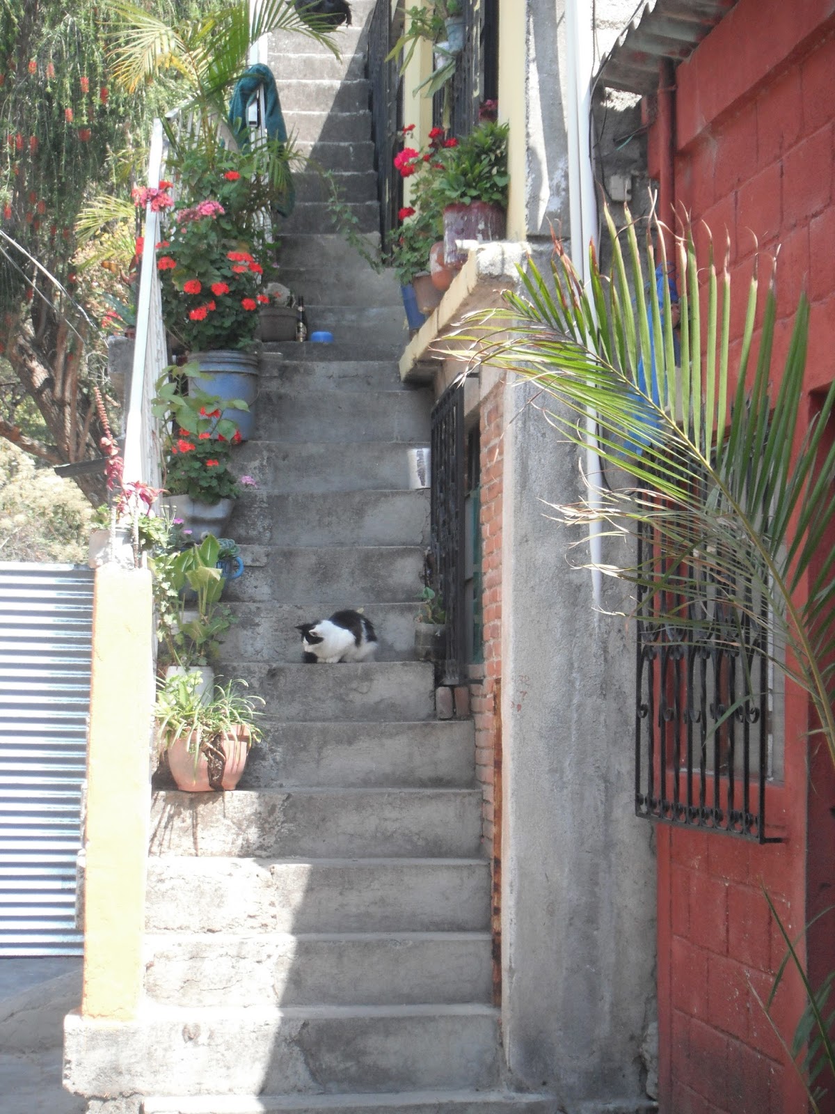 We arrived in San Marcos and hopped off the bus at some random intersection. The driver waved us off uphill a bit when we asked for a bus to Xela. We walked that way for a minute but didn't see any buses, so we sat in the shade to collect ourselves. I noticed a sign that said bathrooms, desperately needed, so we walked up to the second floor of this big building... and then realized we were on the back side of the bus station! Another great fortuitous moment. :)